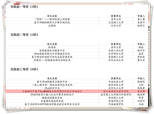 12月18日至20日,第一届下一代互联网技术创新大赛全国总决赛在清华大学举行,由我校王义勇、俞华锋、蔡暐、董一方老师指导,李永辉、韦志刚等同学参赛的作品《大数据时代基于6LoWPAN技术的智慧社区医疗系统设计》荣获实践组三等奖。我校是唯一一所在决赛中获奖的高职院校,其余大多为211、985高校。