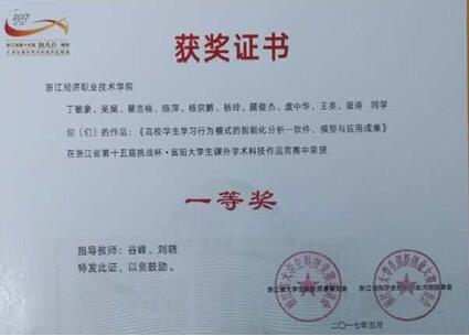 5月19日,2017年浙江省第十五届“挑战杯•富阳”大学生课外学术作品大赛(简称“大挑”)在浙江工业大学结束。我院师生团队与本科院校同台竞技,《高校学生学习行为模式的智能化分析》团队荣膺一等奖,创我校参加“大挑”竞赛的历史新突破,在全省高职院校中名列前茅。
