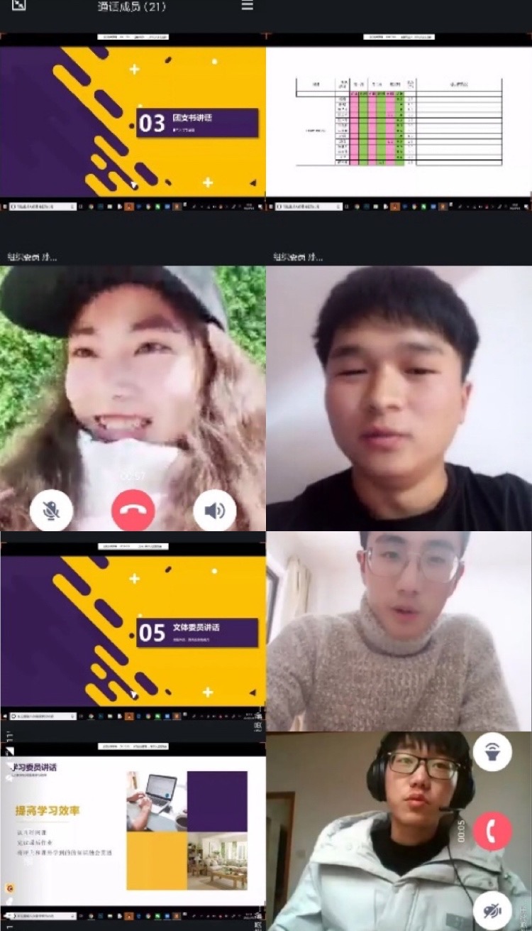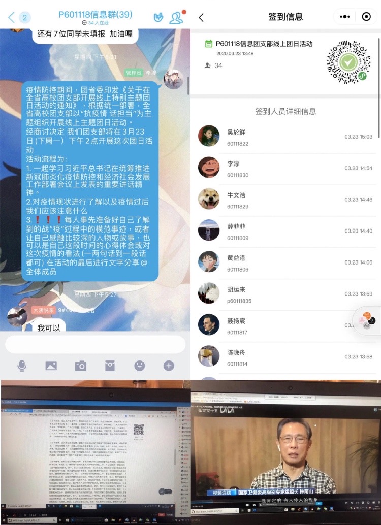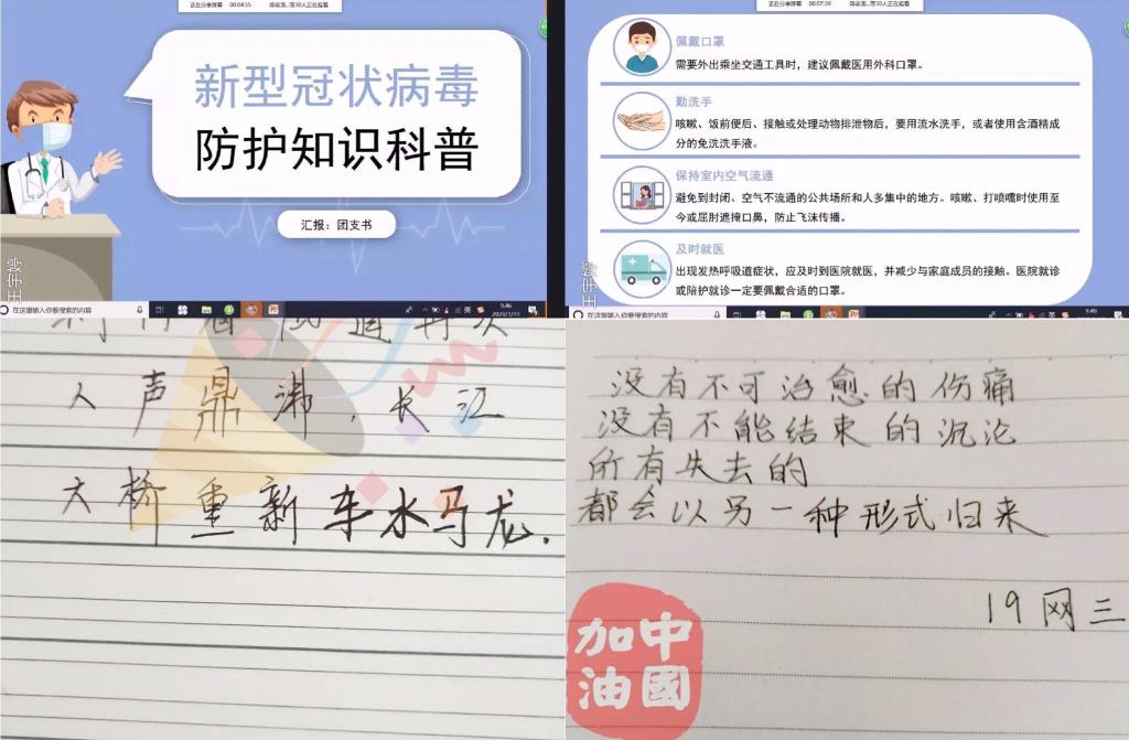 除此之后我们还开展了以“共筑心防,携手抗疫”的心理主题班会,团员们也开展了激烈的讨论。关于“停课不停学”网课学习安排,团支部团员也是活跃参与,在课上和老师互动,课后主动提交作业。真正意义上的做到了“停课不停学”的根本意义。