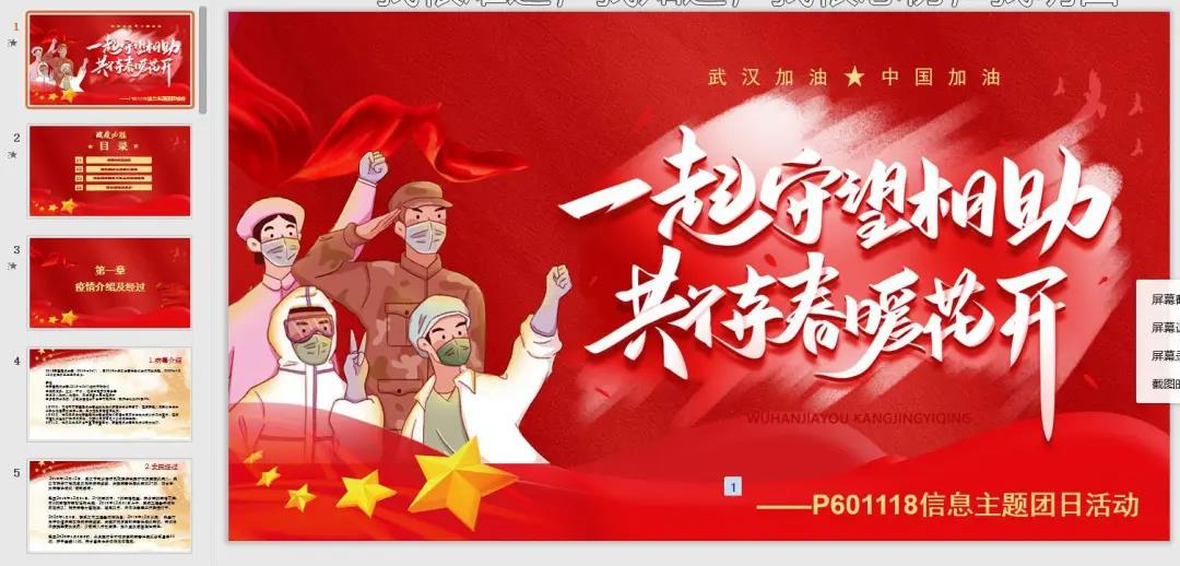 因为疫情缘故,我们在班级群里举办了这次活动。由团支书主持活动的展开,其余班委辅助工作。由团支书主讲结合PPT,教授此次新冠病毒相关知识。大家积极在群里发表对疫情感悟,之后,召集同学手写感悟,使这次活动更加的丰富多彩。