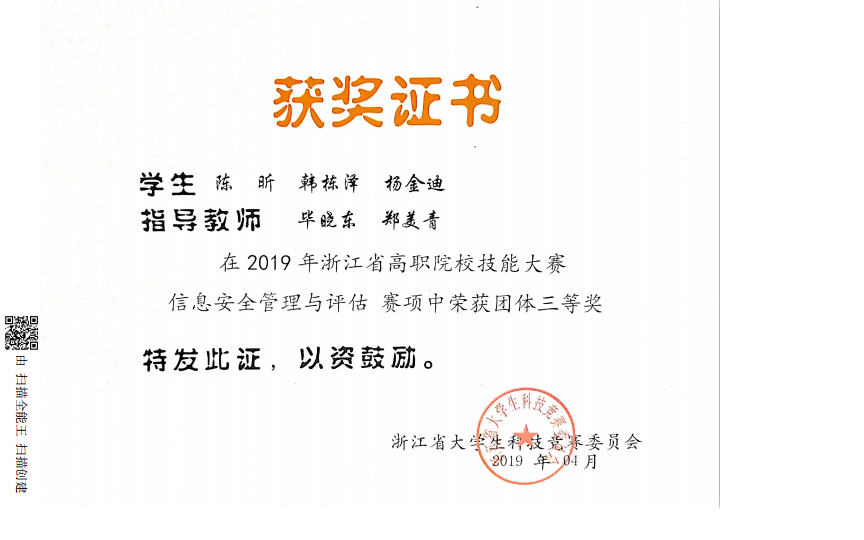 2019年浙江省高职高专院校技能大赛信息安全管理与评估竞赛团体三等奖