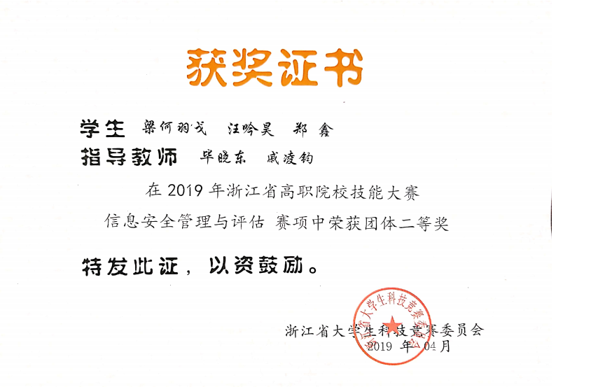 2019年浙江省高职高专院校技能大赛信息安全管理与评估竞赛团体二等奖