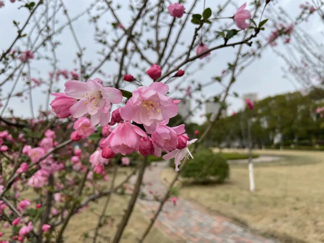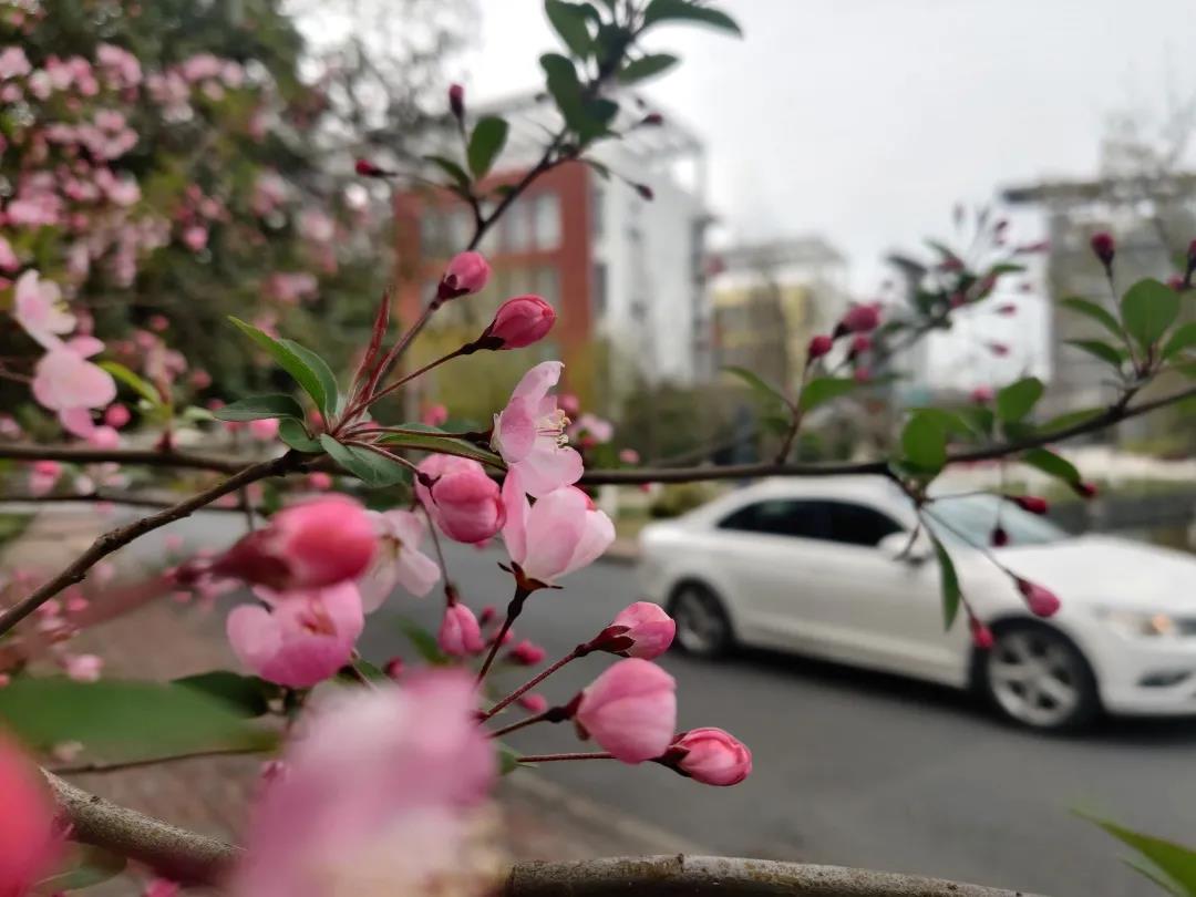 路边的海棠花羞羞答答的探出了头,像极了含蓄的少女,看着人来人往,羞红了脸。
