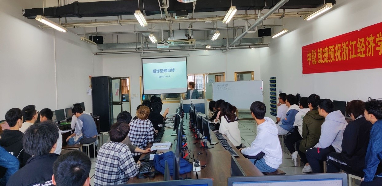 原来,这是数信学院积极响应习近平总书记打击治理电信网络诈骗犯罪号召,在学校保卫处指导下开展的反诈系列专题活动之一“师生总动员,共筑防骗墙”。作为全校计算机公共课实训基地,装修一新的数信学院实训基地迈出了公共宣传服务的第一步。