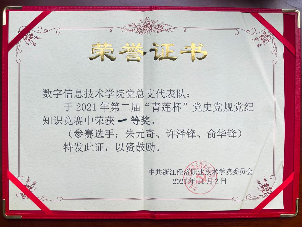 11月2日下午,由中共浙江经济职业技术学院委员会主办的第二届“青莲杯”党史党规党纪知识竞赛决赛在崇学楼三楼报告厅举行。其中,数字信息技术学院党总支代表队获得一等奖。