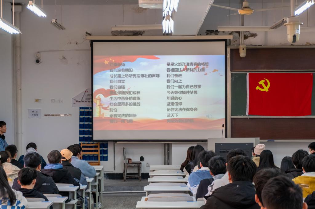 活动现场同学们放声高歌:“红旗长扬,我们迎着朝阳,成长路上,聆听宪法雄壮的声响……” 激昂嘹亮的歌声彰显着同学们学习宪法的热情。