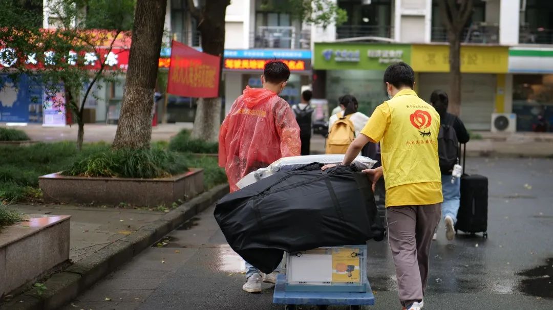 我院的志愿者团队分工明确、张弛有度。尽管是在天气恶劣的情况下,他们也不畏风雨,迎难而上,依旧积极上前帮助返校生们,确保同学们能够在开学日平安顺利地入校。