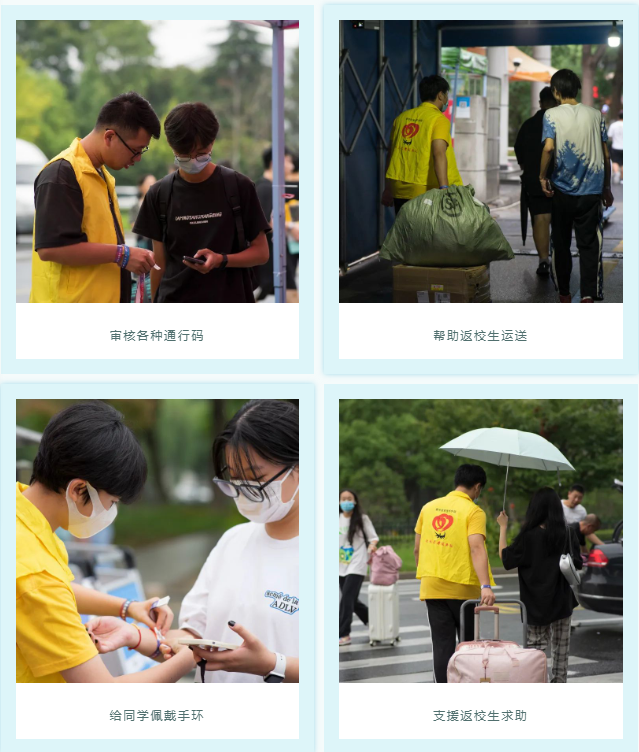 早上八点,身着明黄色院服的志愿者们好似第一抹骄阳,为每一位前来报道的同学送上了新学期的第一份慰问。他们主动热情,一边引导同学们出示健康码,一边引导学生们佩戴好报到手环;他们坚持负责,无论是早日逐渐升高的气温或是午间不期而来的暴雨,他们也都在志愿服务一线默默坚持,为每一位返校的同学送上健康返校指南。