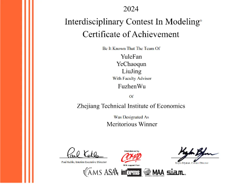 近日,2024年美国大学生数学建模竞赛(MCM/ICM)成绩揭晓。在我院数学教研室吴福珍、王文慧等老师的指导下,由刘婧、叶超群、范雨乐三名学生组队,经过了4天4夜的鏖战,在国际数学建模的舞台上崭露头角斩获M奖(一等奖),这是数学建模继获国赛一等奖之后的又一新突破。
