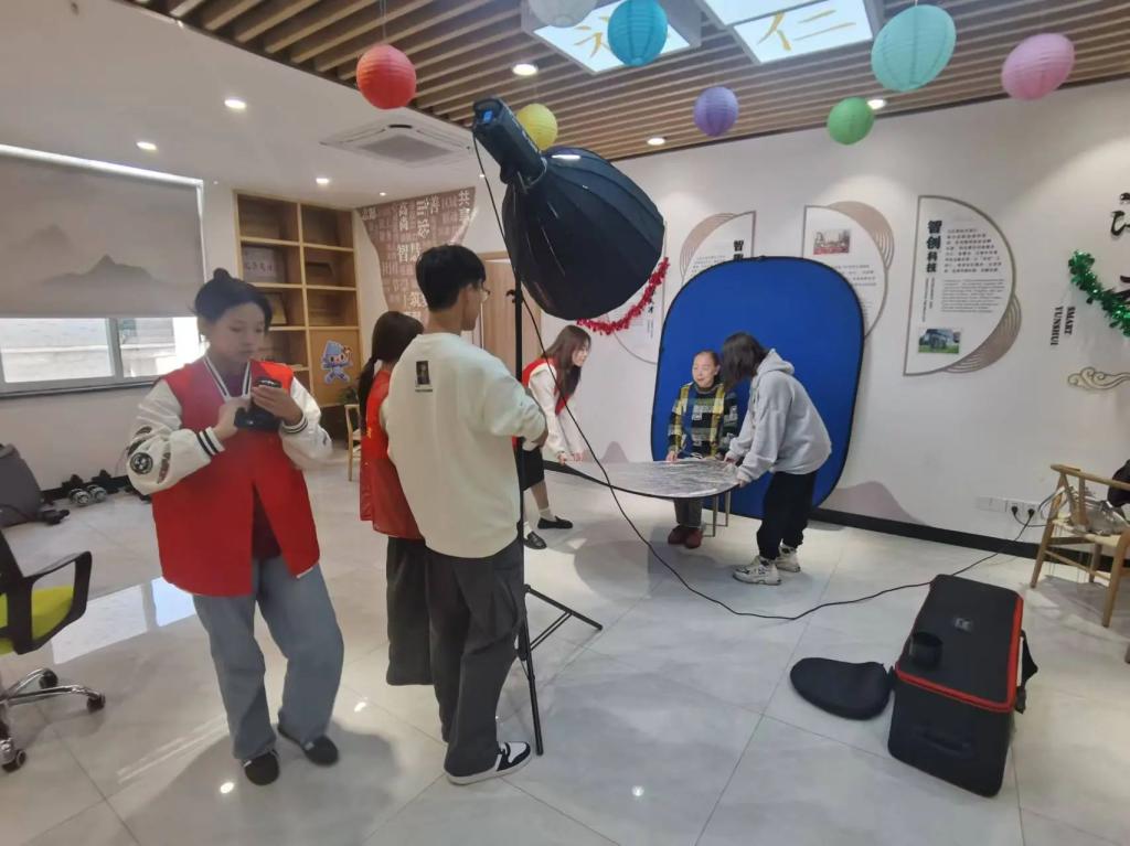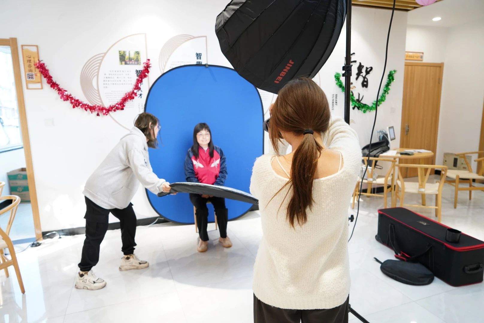 我院“5v社”学生志愿者们携带专业的摄影设备来到云水社区服务中心,提前布置好拍摄场地。他们分工明确,有的负责接待居民、登记信息,有的则专注于调整灯光、背景等细节,确保每一张照片都能达到最佳效果。
