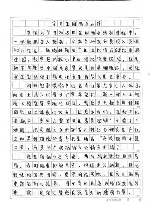 我深刻认识到,国家的发展离不开每一个人的努力,我们都是时代的参与者和创造者。在今后的学习和生活中,我将以两会精神为指引,努力提升自己的专业素养,勇于创新,敢于担当,以实际行动践行时代赋予我们的使命。同时,我也将积极传播两会精神,带动身边的人一起关注国家发展,共同为实现中华民族伟大复兴的中国梦而努力奋斗。