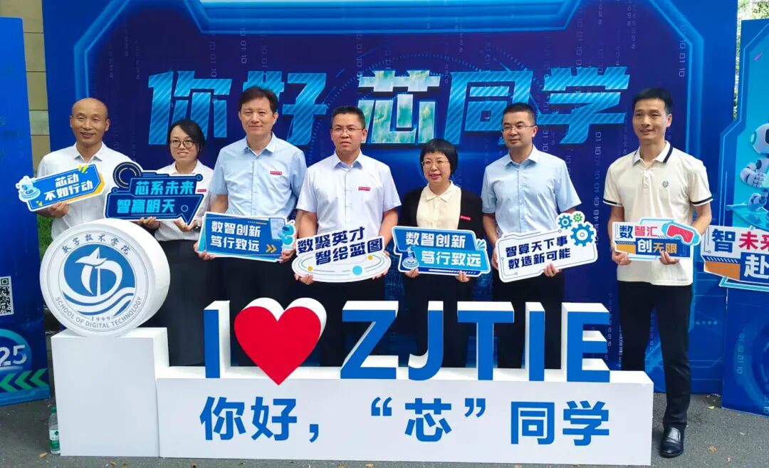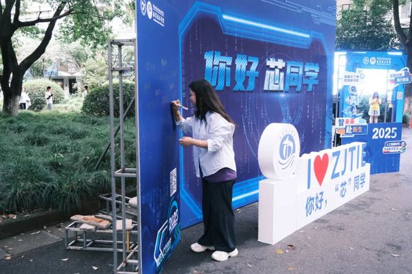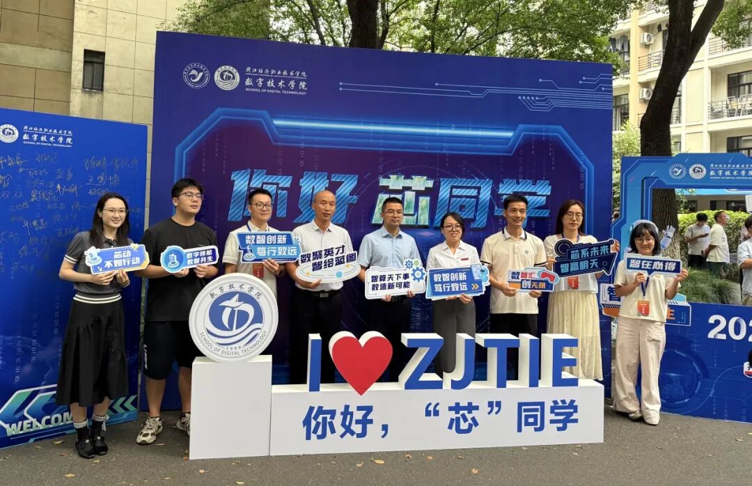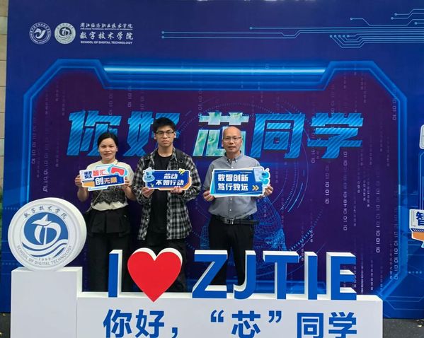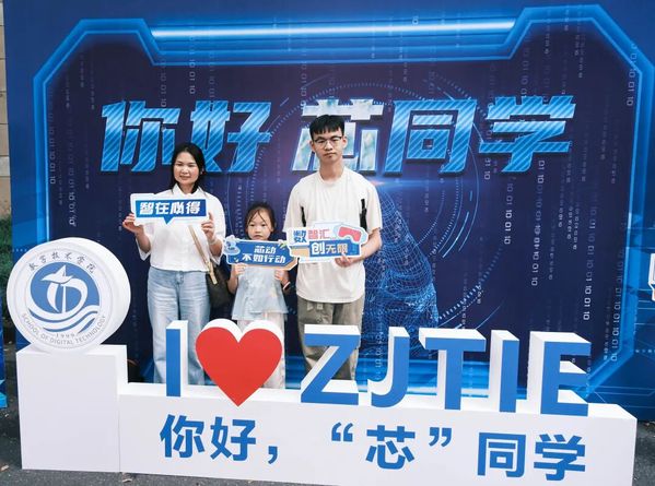 学院精心设置了学院简介喷绘,独具学科特色的展板、趣味合照框以及富含“AI”元素的手持标语,为每一位新生营造出满满的归属感与仪式感。打卡区前,小萌“芯”们兴奋地举起纪念手牌,灿烂的笑容在镜头前绽放,定格下与数字技术学院的第一个美好“芯”瞬间。