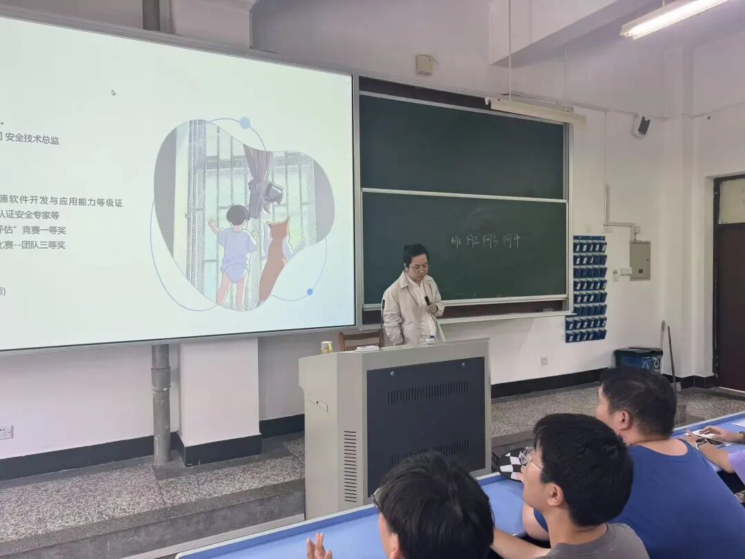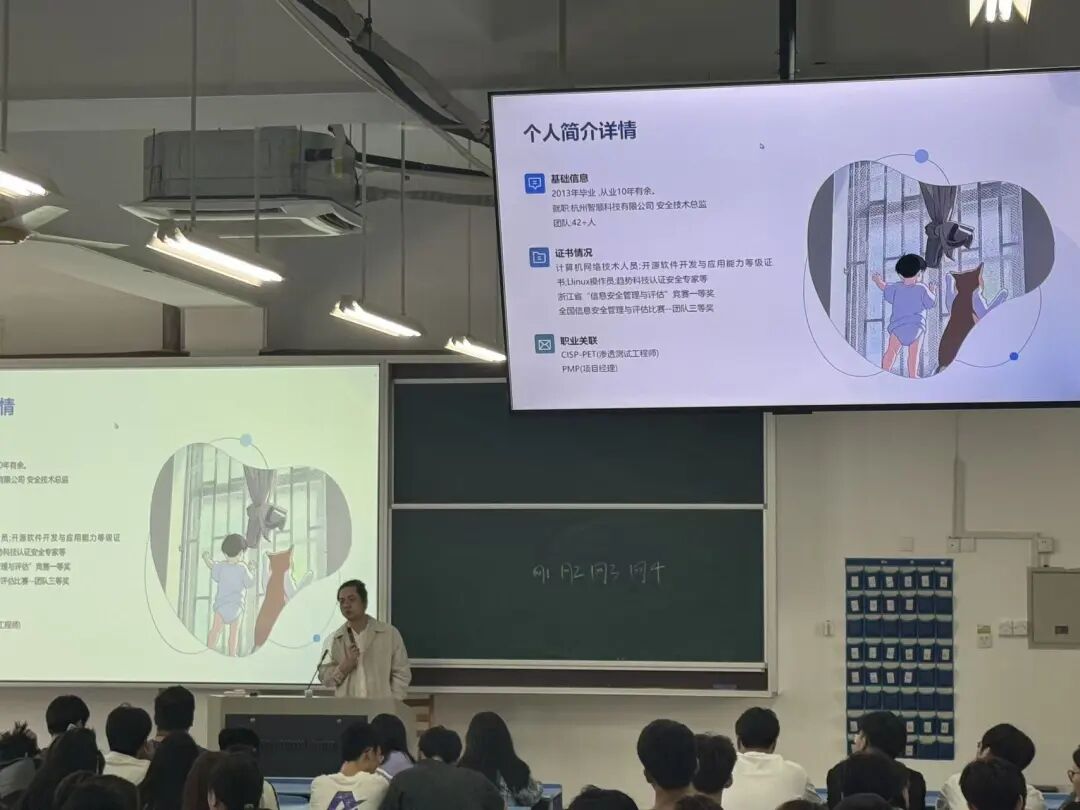 他详细介绍了当前网络安全行业的发展趋势与人才需求,结合国家政策、法律法规及技术演进,为同学们剖析了行业面临的机遇与挑战。他还分享了智顺科技的企业发展历程与业务布局,指出“保密安全”“数据安全”等方向已成为行业新赛道,对高素质、复合型人才的需求日益迫切。