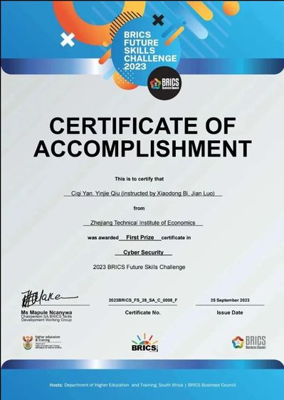 2023年获得金砖国家职业技能大赛网络安全国际赛一等奖。