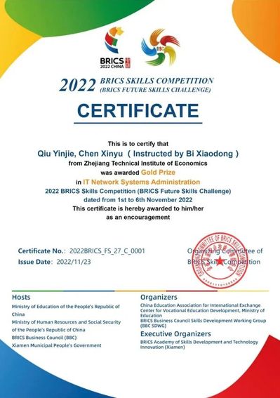 2022年获得得金砖国家职业技能大赛IT网络管理国际赛金牌。